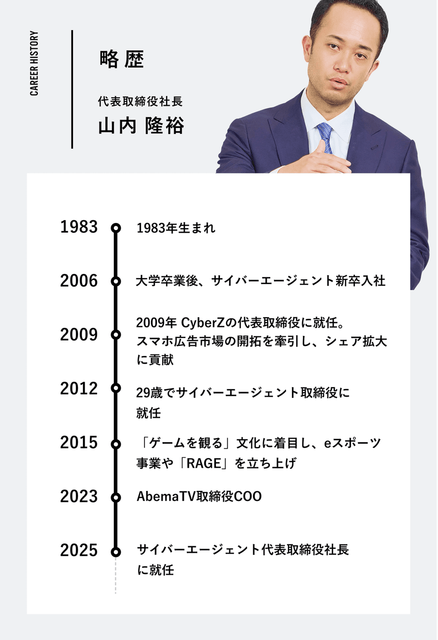 当時、サイバーエージェントが掲げた全社戦略「スマホシフト」のなかで、山内はスマートフォン広告領域の開拓を最前線で推進。CyberZでの事業成長を通じてグループ全体のスマートフォン広告シェア拡大に大きく貢献しました。2010年代半ばには「ゲームを観る」文化の醸成を目指し、eスポーツイベント「RAGE」などの立ち上げに尽力。新たな事業領域の確立に取り組みました。