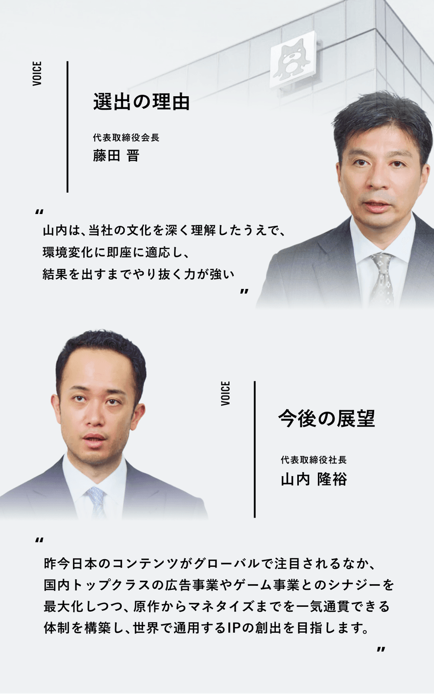 その上で中長期的に見据えるのは、真のグローバル企業への進化です。昨今、日本のコンテンツが世界で注目される中、国内トップクラスの広告、ゲーム事業のアセットに加え、自社メディアを通じた発信力やIP展開のノウハウを掛け合わせ、グループシナジーを最大化していきます。原作の創出から、メディアを通じたファン形成、そして世界展開までを一気通貫できる体制をさらに強固なものにする。藤田から受け継いだ「21世紀を代表する会社を創る」というビジョンを、社員と共に実現していく覚悟です。
