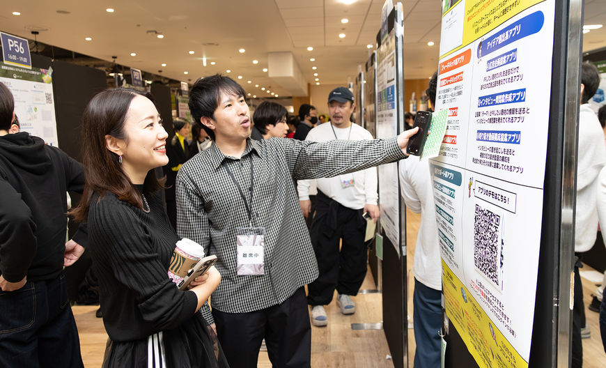 ── 出展者と参加者が熱心に話し込んでいる様子があちこちで見られました。単なる発表の場にとどまらない、新しい化学反応が起きていますね。