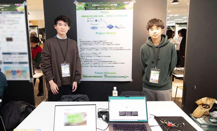 AI事業本部 AI Lab Audio:私たちのチームからは目的話者の音声認識のデモ展示をしました。AI Fesは大盛況で多くの人が往来する騒がしい環境ではありましたが、音声強調技術や目的話者の音声抽出技術を活用し、リアルタイムで自分の声だけが認識される様子を体験していただきました。